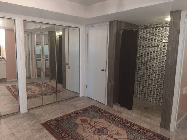 Full wall glass and doors give you views and access to the balcony from both the master suite and the living room. The master suite has a large dressing room/yoga space, make-up vanity area, new custom walk-in shower, toilet room and wall to wall closets.