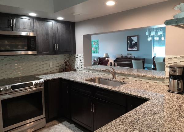 Comprehensive remodel including new kitchen, granite counters, glass tile and new tile flooring throughout. The eat-in kitchen is complete with small appliances, cookware and a few paper products and cleaning supplies to get you started.