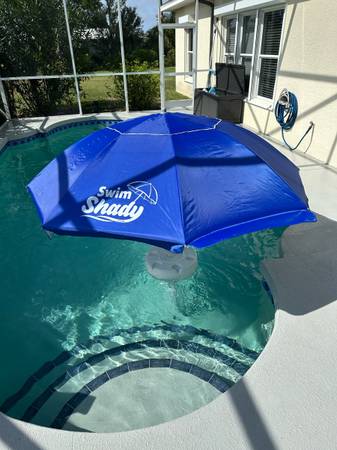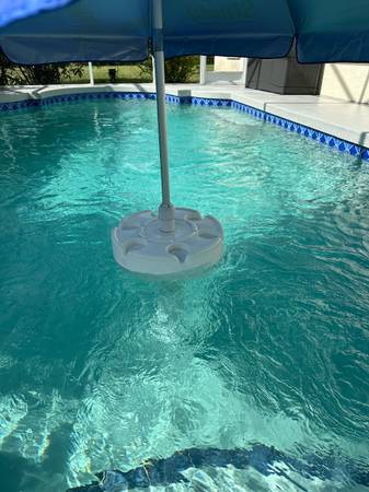 This 7ft diameter Swimbrella provides shade for you in the pool and allows you to rest your drinks on it. Holder is filled with gravel and pebbles $100 OBO