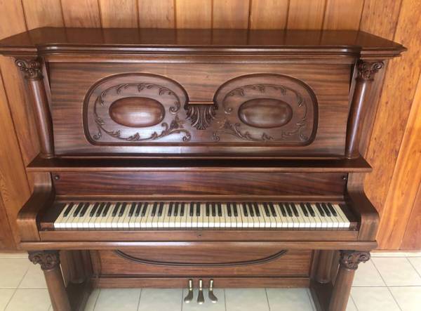 Beautiful Mahogany body with Ivory Keys M. Schulz Upright Piano. Crafted in Chicago, IL. One of the finer pianos made back in the golden era of acoustic pianos. Needs a good home. If you have the room, it is valuable simply for the gorgeous carved mahogany body. Needs to be moved immediately as home is being sold. Piano must go. May be able to offer some help in moving. Thank-You